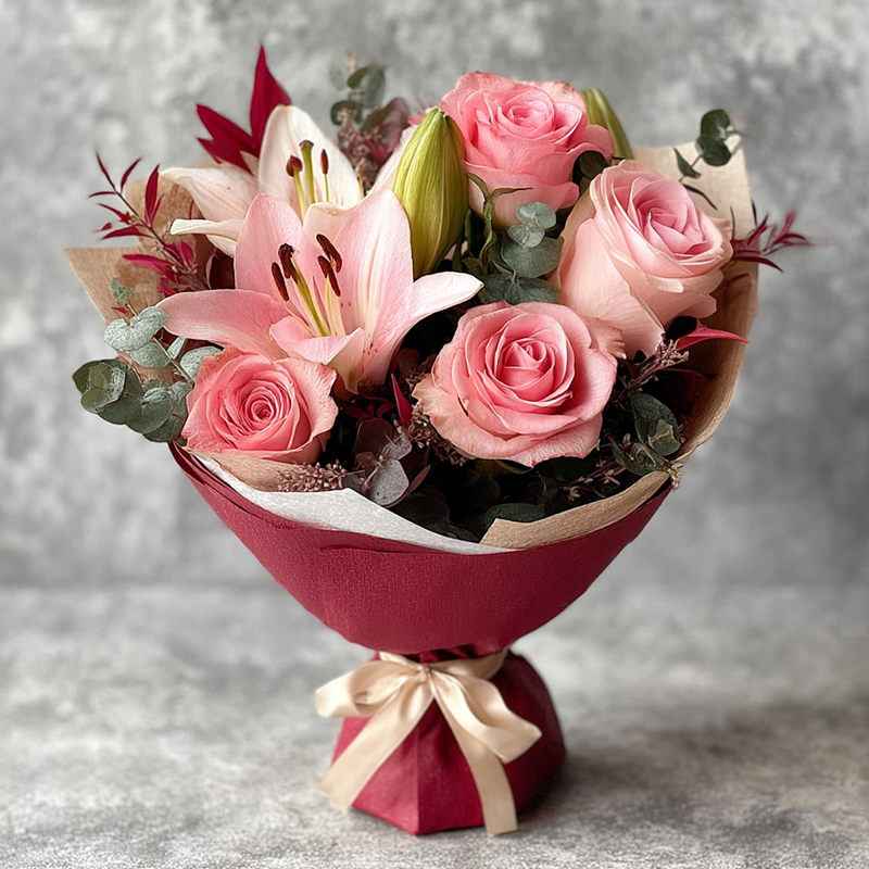 This bouquet is a gentle whisper of spring. Pink roses, like a shy maiden’s smile, unfurl in delicate ripples, each petal hiding a subtle sweetness. Pink lilies, like graceful fairies, stretch their petals like an unfolding dream, with a pure and fragrant heart. Eucalyptus leaves and red twigs add a touch of crisp freshness and fiery charm to this romance. Wrapped in deep red paper and tied with a beige ribbon — like a tender embrace — they hold all the softness of spring and the heartfelt emotions of the blooms. Every glance falls into a pink-tinted dreamscape, where gentle beauty and fragrant grace bloom endlessly.